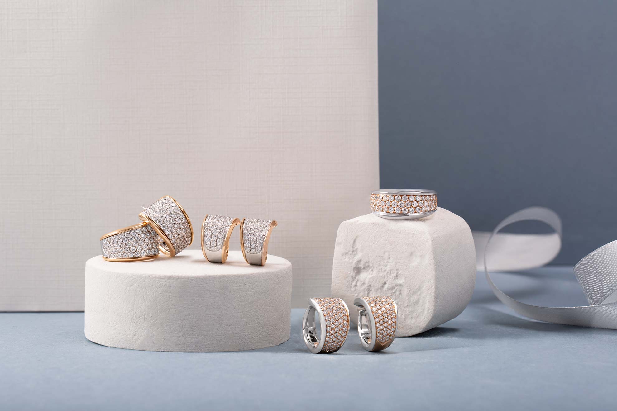 FASCE verkörpert modernen Luxus in seiner reinsten Form. Die Kollektion besticht durch kraftvolle Linien, großzügige Volumen und ein harmonisches Zusammenspiel von Weiß- und Roségold, vollständig besetzt mit Pavé-Diamanten. Jedes Stück ist ein Statement – kraftvoll, luxuriös und mit unverkennbarer italienischer Finesse inszeniert.